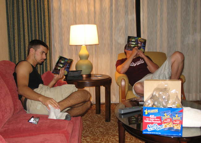 Andy & George reading the rules for "World of Warcraft" TCG. Each swag bag had a starter kit.