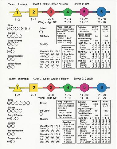 The charts are duplicated for each car so that the page could be cut in half so 2 players could play the team and each have their own dashboard. I realize that some players may not use the exact charts that we do and I am thinking of enhancing the next version, so that a player can enter their own values.